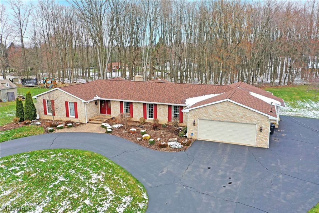 A visual masterclass in ranch layouts, this sprawling Howland home showcases two floors of gorgeously finished living space throughout its expansive footprint! Set far off the road and behind a looping, horseshoe driveway that allows for valet like personal experience, this outstretched, all-brick structure is quick to impress as manicured landscaping outlines the flaring, stone sidewalk leading to the double door front entry. A covered side patio extends from the garage as a pair of additional backyard deck spaces are available both from the sunroom and a private patio directly from the oversized master suite. Inside, the grand foyer branches away into a short hall, cracking fireplace adorned family room and sunken front living room as sunshine warms the plush carpets underfoot. The raised formal dining room oversees it all with its rich, red wall coloring. Past the family room, an elaborate rear sunroom boats tall, wood trimmed ceilings and illustrious surroundings, perfect for entertaining. Further in, an elaborate kitchen wows with polished stone countertops and a matching glass tiled backsplash that runs between the deep stained cabinets and stainless brightwork. First floor laundry is found just past the casual dining nook as a half bath joins in nearby. Around the corner, a sizeable rear office completes the wing. Opposite the foyer, a short hall bridges the three, spacious bedrooms as they accompany a must-see full bath and its stylish, tiled shower. The master suite offers its own full bath with like styled appointments and a walk-in closet. Downstairs, both a finished rec room and guest bedroom join the immense storage solutions.